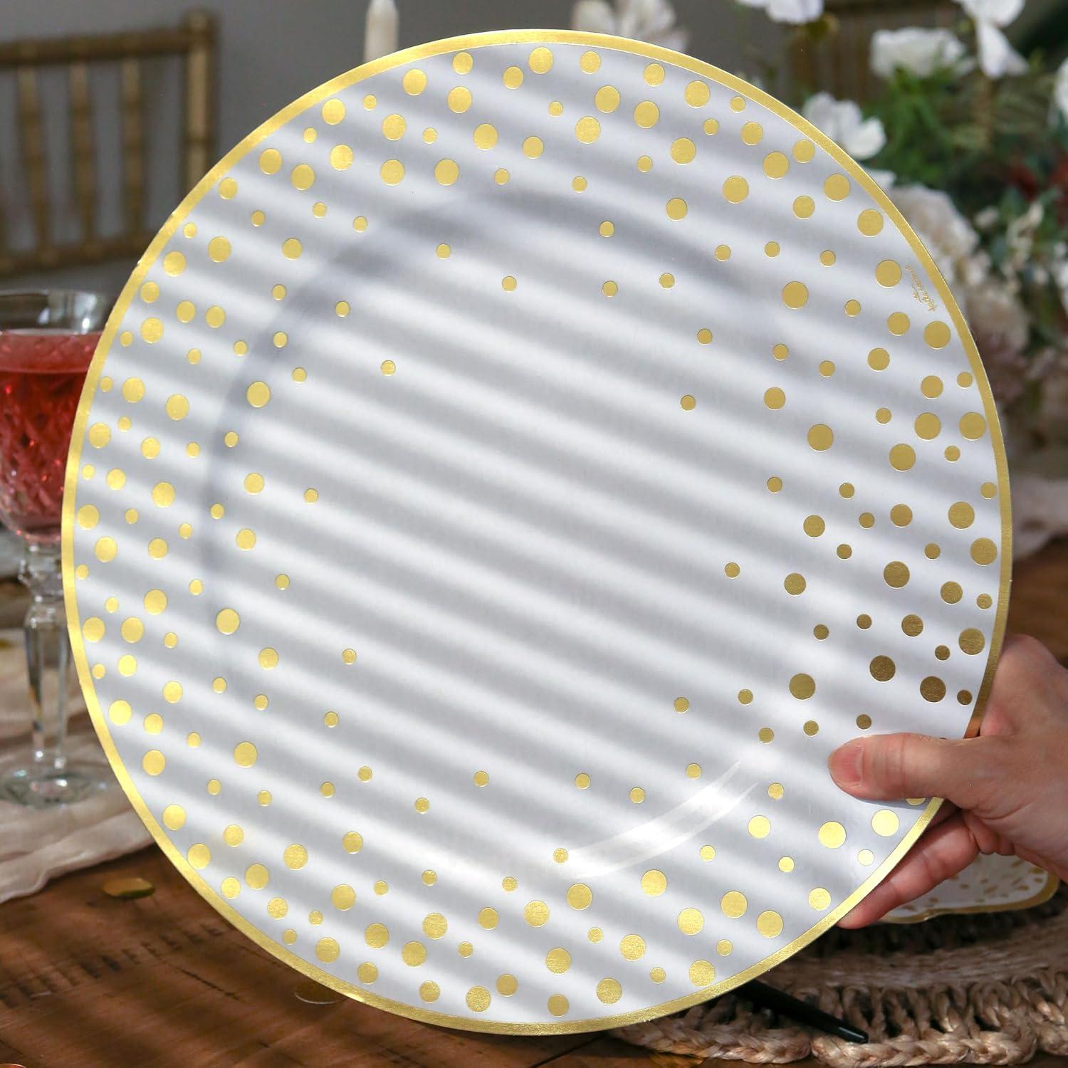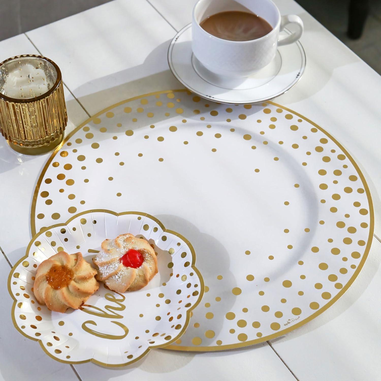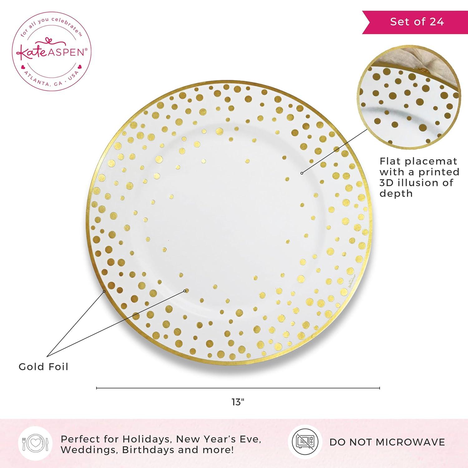 At Kate Aspen we love adding chargers to our table settings when hosting, but we don’t love doubling our dishes. That's why we created our 13” Classic Gold Foil Dot Charger/Placemats. Our 13” Classic Gold Foil Dot Placemat set includes 24 elegant placemats with a gold foil confetti border. From Thanksgiving to New Years there are so many reasons to host and celebrate. These charger placemats are 100% flat but they are designed with a stylish 3D effect look that creates an illusion of depth, enhancing the overall presentation of your tableware. Chargers are great for protecting your table and tablecloth. Chargers take a simple place setting, elevate it, and make it special. Making a spillproof paper charger takes a normal charger and improves upon it, because now instead of adding more work for cleanup, you can simply toss these away. Because our durable paper placemats lay flat you can also use them under steering dishes to protect your counter and surfaces from messes while also showcasing your dishes. These charger plate placemats are not microwave or dishwasher-friendly. This set is shrink-wrapped and placed in a cellophane bag. They are 100% food-safe and have a spillproof finish that allows them to be used multiple times. Grab a set today and pair it with our Cheers 72 Piece Party Tableware Set of disposable plates and napkins.
