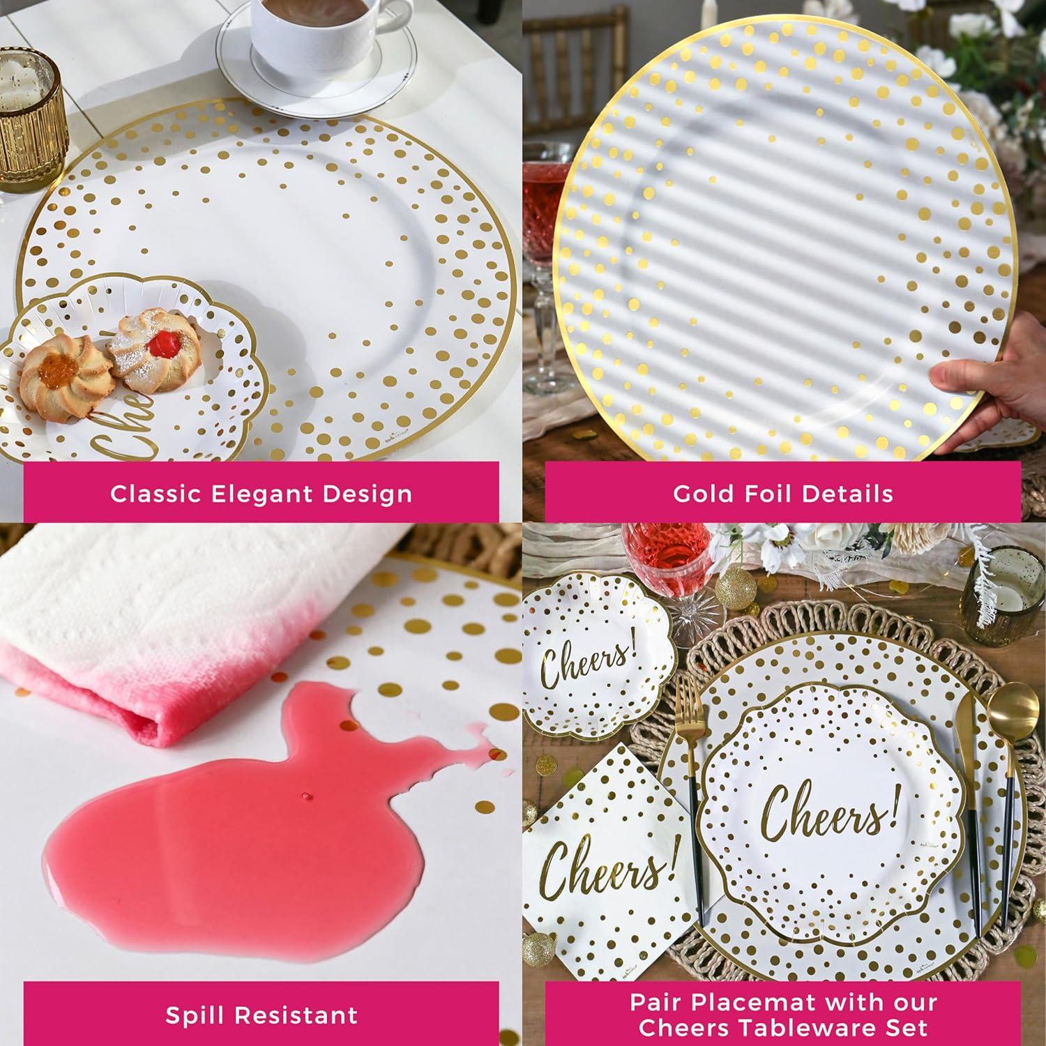 Kate Aspen 13″ Disposable Holiday Placemats/Chargers, 24-Pack – Spillproof & Durable Classic Gold Foil Cheers Design & 3D Effect Illusion(Cheers)