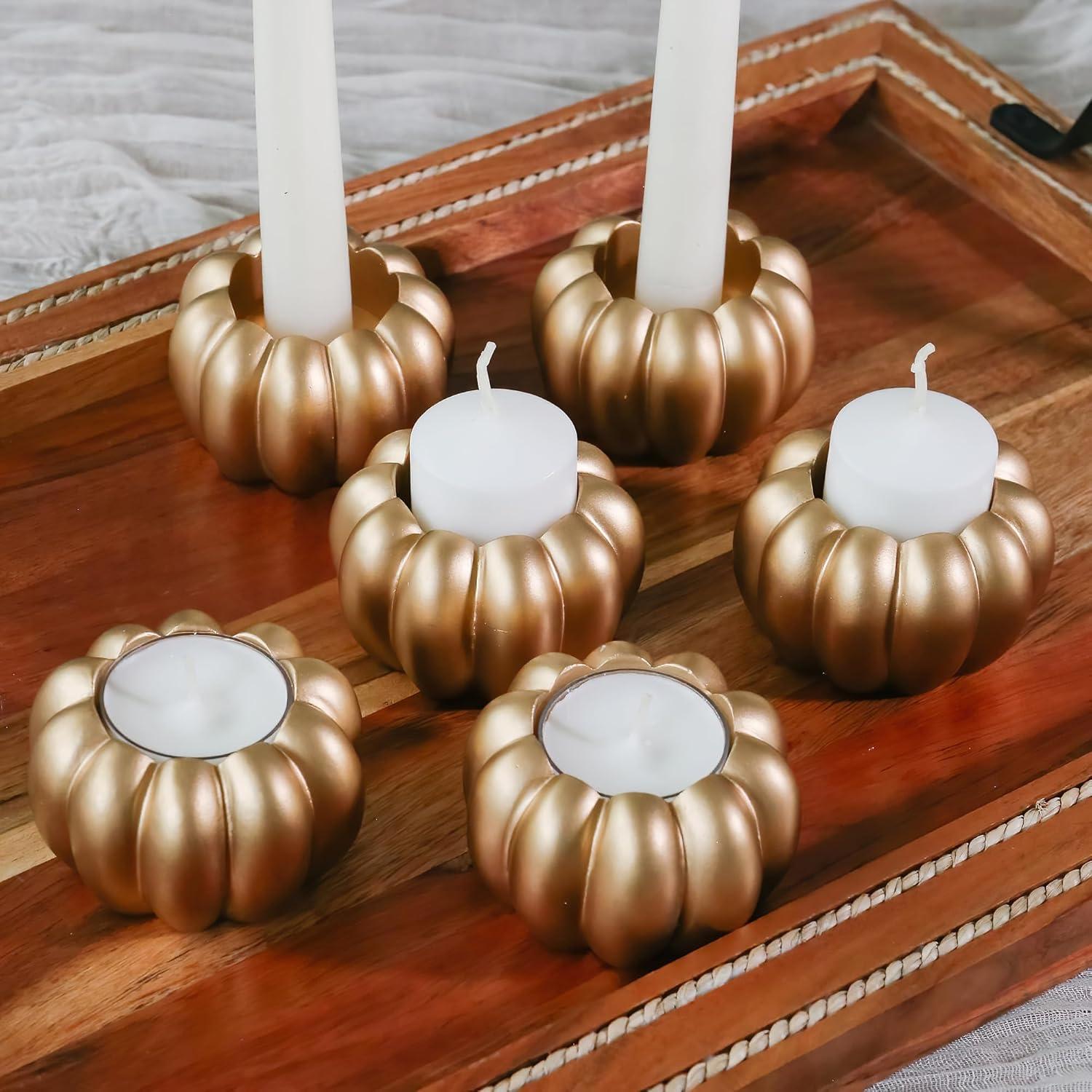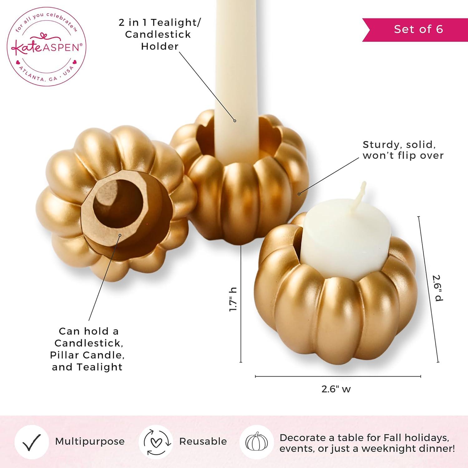 Kate Aspen 2-in-1 Gold Pumpkin Candle Holder Set – Fall Taper, Tealight & Votive Candle Holders – Thanksgiving Table Decor, Pumpkin Centerpieces, Halloween Candlestick Holder (Set of 6)(Gold)