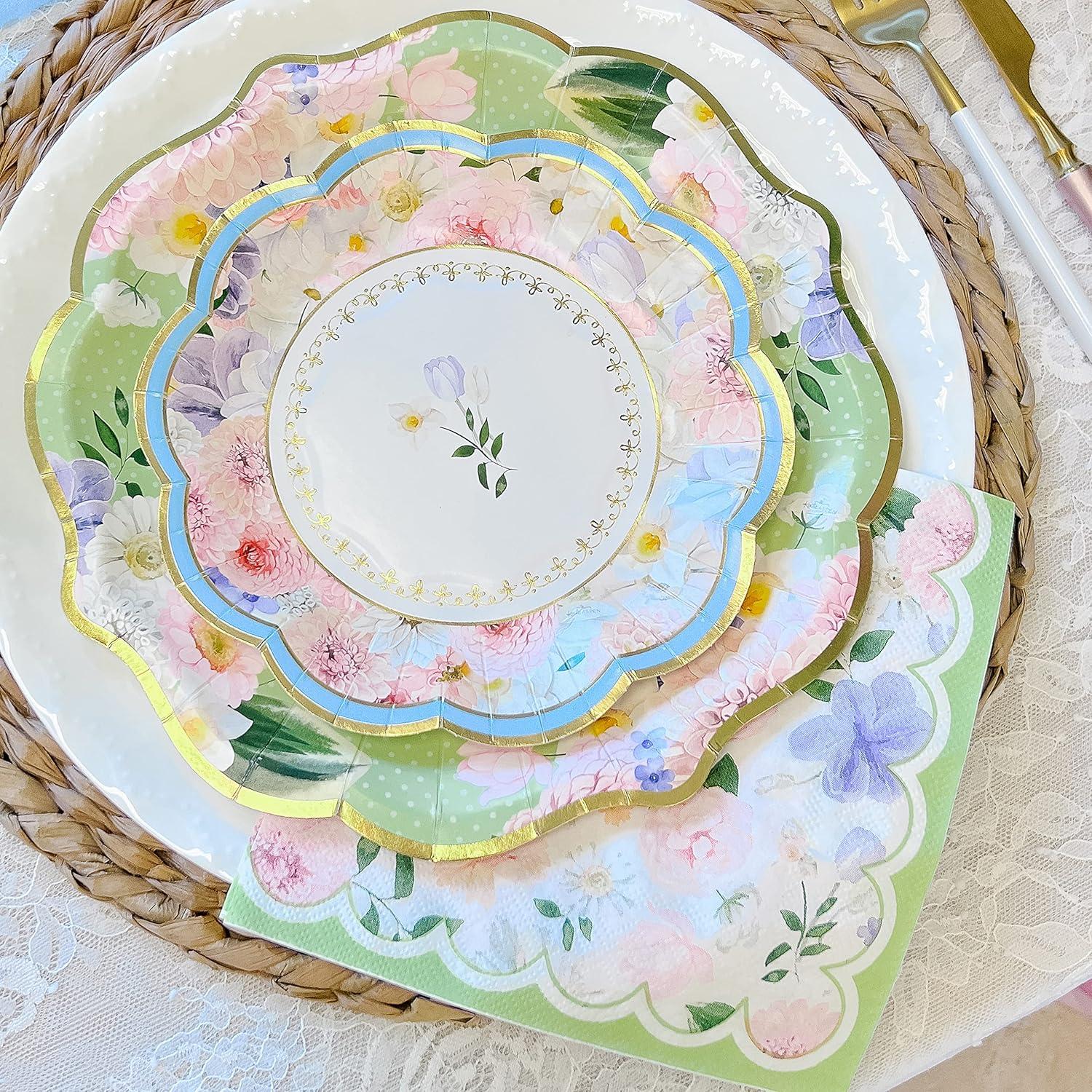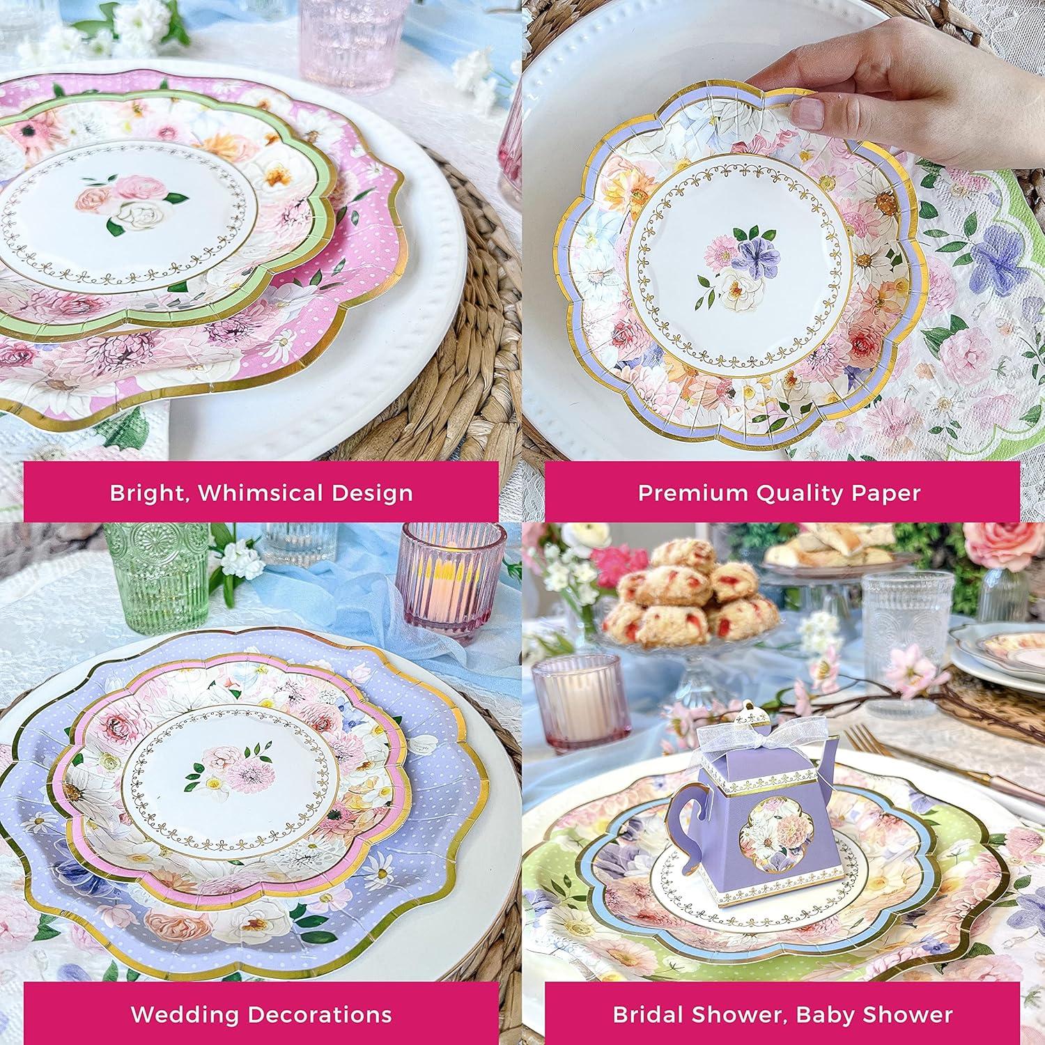 It's tea time! These whimsical plates designed with pastel florals and scalloped edges take your table from drab to fab.They are designed with the bold colors being on the rim so that each meal on the plate looks like it is being framed. Our Tea Time Party 9″ Premium Paper Plates – Assorted (Set of 16) might make your food taste even better just being on these beauties. They also make the perfect backdrop for our 7in plates of the same collection but with a coordinating design not exactly the same print. We do this purposely to accentuate each piece of our collection. They compliment each other bringing the design to life. They bring your theme and decorations to life all the way down to the place settings. Bring all the beauty of printed china with none of the chore of having to do the dishes. Making your table pop with your tea time theme or garden party. Our Tea Time Party 9″ Premium Paper Plates – Assorted (Set of 16) were designed to bring your table alive with each featuring a center floral bouquet with gold foil details surrounded by a sorbet colored background in 4 colors, pink, blue, purple and green and covered with sections of cluster florals. The second gold foil stripe border is laid around the scalloped edge. These premium paper plates were built with delicious bites in mind. These plates can stand up to your favorite delectable bites and decadent morsels. Perfect for your next garden themed baby shower or tea time bridal brunch. They make the perfect base for the 7 inch plates in the same design and pair beautifully with our matching napkins. These premium quality paper plates are shrink wrapped in a set of 16 but do not microwave because of the gold foil. Get yours today and start planning your next tea party!
