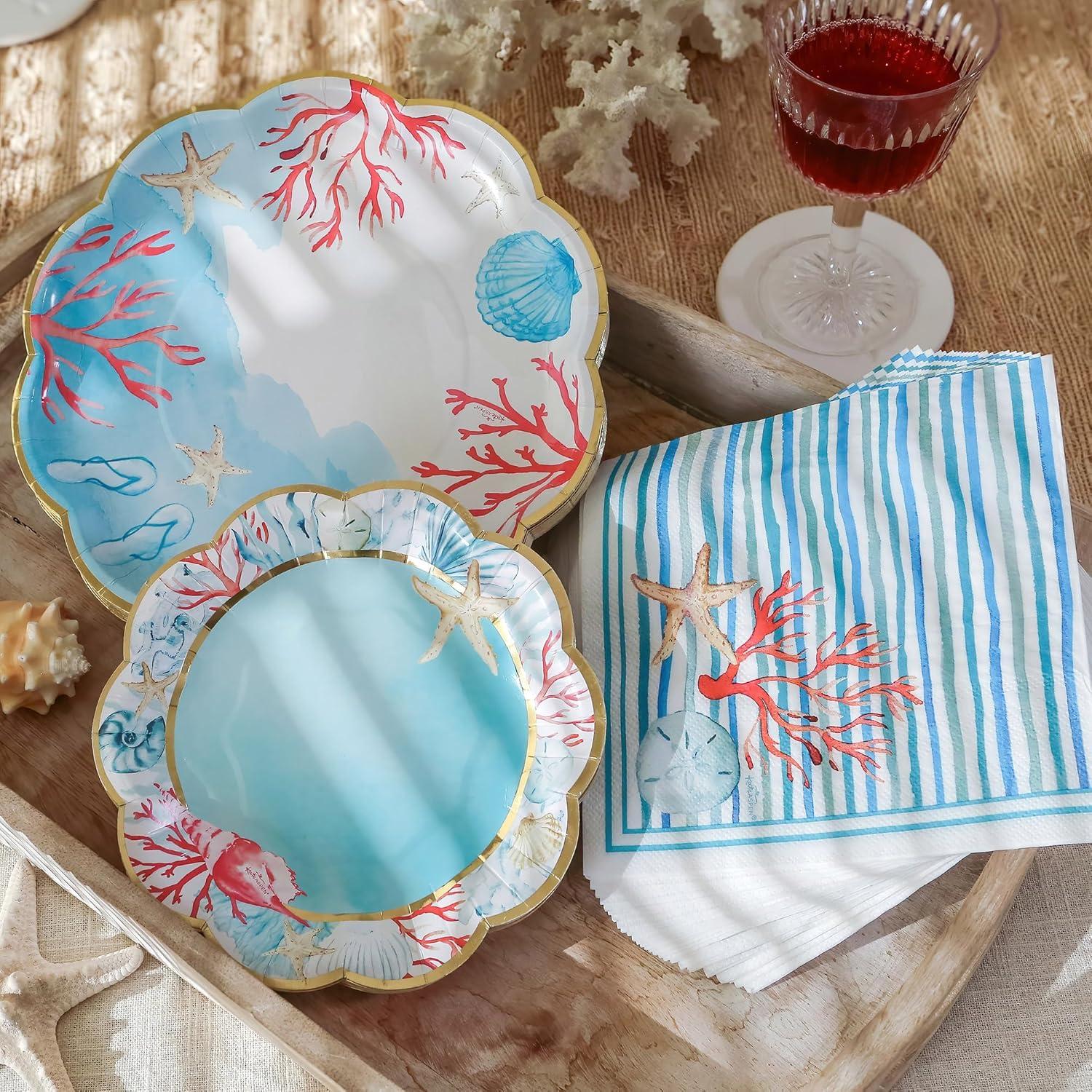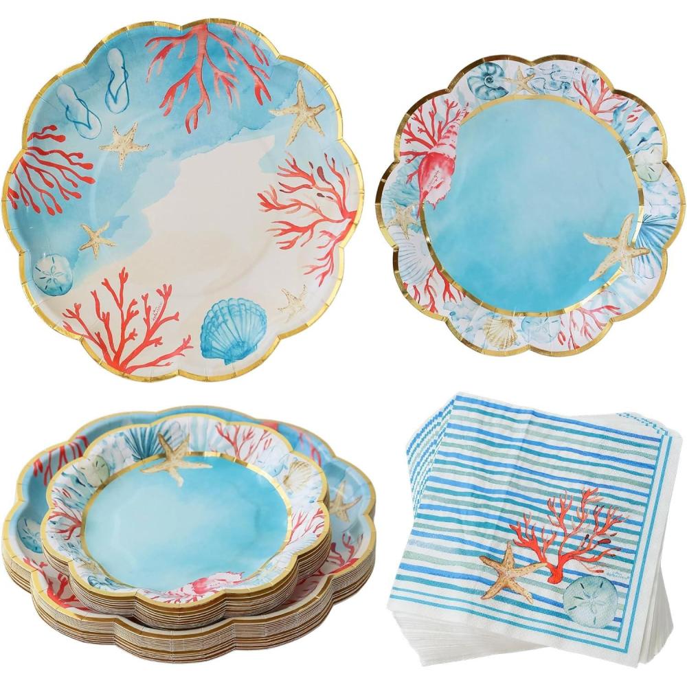 Kate Aspen Burlap & Lace Party Decorations – 62 Piece Rustic Bridal Shower and Wedding Tableware Set for 16 Guests – Disposable Floral Paper Plates and Napkins Party Supplies(Beach Party)