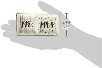 Kate Aspen white ceramic Mr. And Mrs. wedding ring holder dish has stripe details on the Mr. Side, dot details on the Mrs. Side, and a gold foil border bringing the two together! Use as a safe to store your wedding rings while you’re doing yard work, washing dishes, showering or cleaning house. Use as a catchall dish for keys or spare change.Kate Aspen