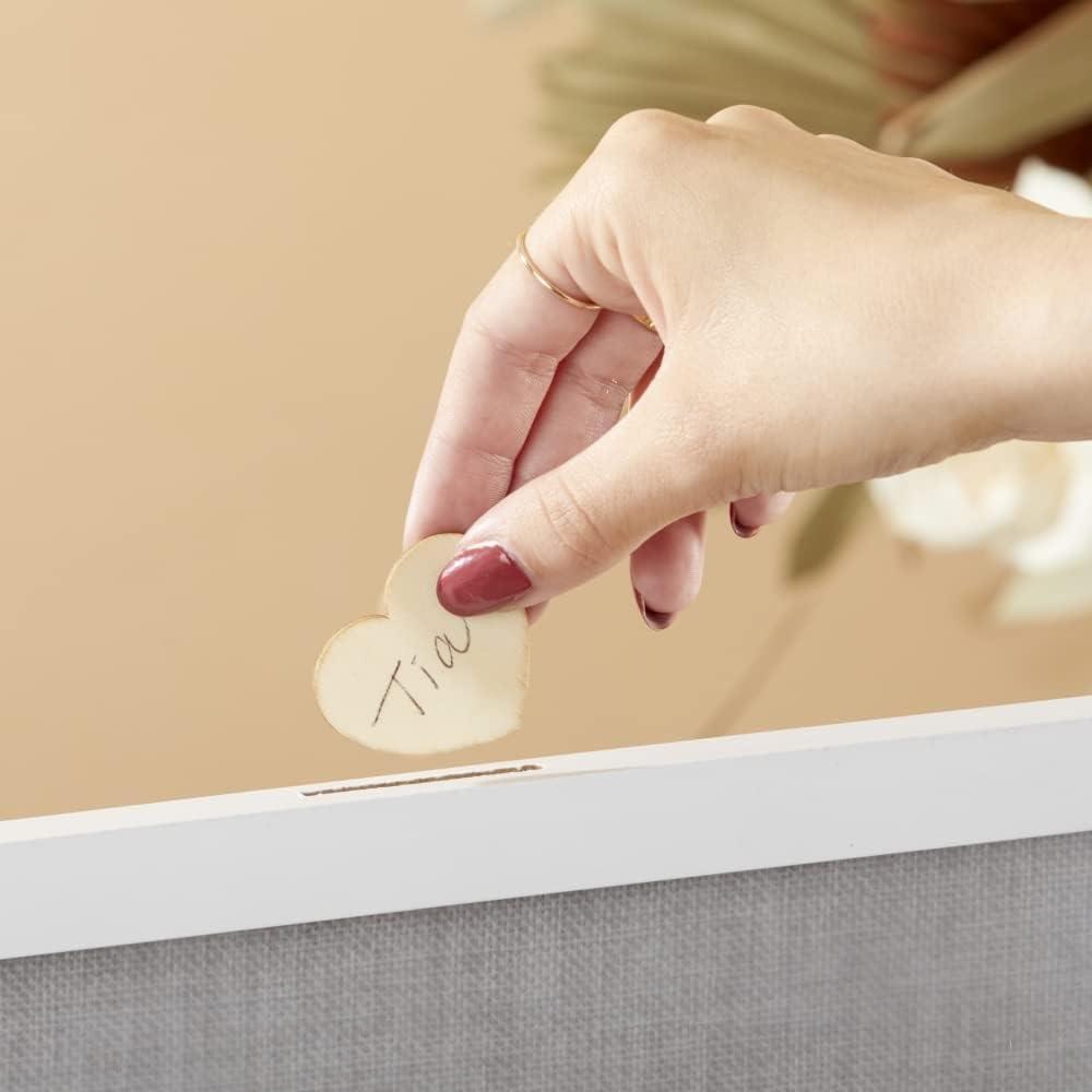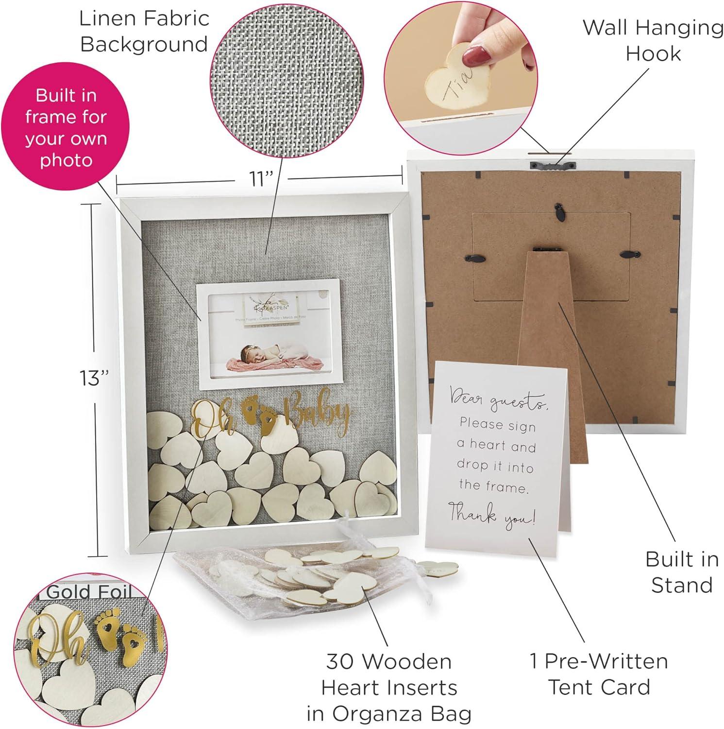 Kate Aspen baby shower guest book alternative frame is a 3d guest book alternative that utilizes thin wooden hearts bearing your guests' Signatures and places them inside of a beautiful gender neutral shadowbox frame. This guest book idea allows you to take a very special memory and hang it on your wall or display it on a table top for many years to come. The baby shower guest book alternative uses shades of white, light Gray, and gold to create a new type of guest book that fits right in with any baby shower theme you have in mind!
