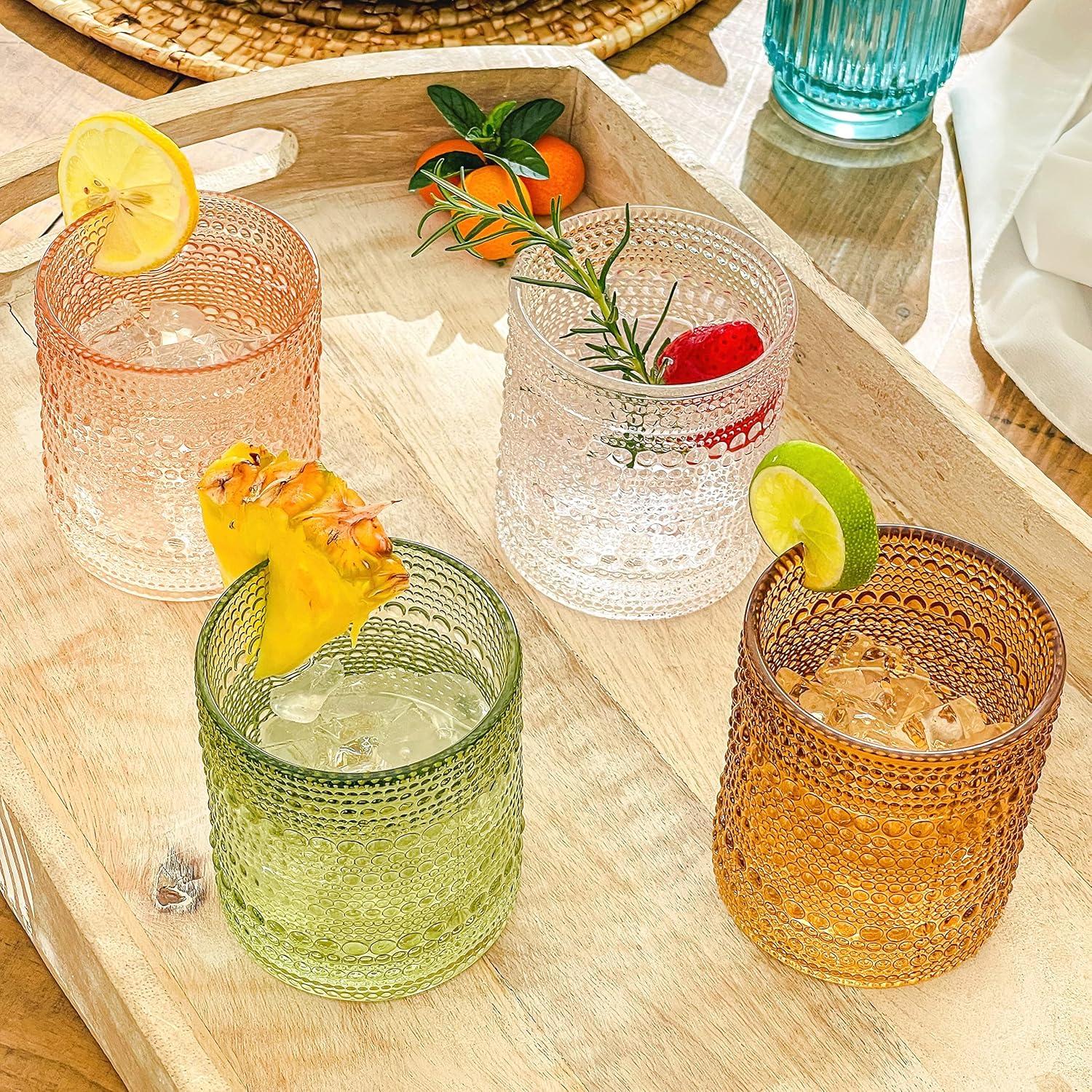 Add timeless charm and color to your kitchen with this 13 oz. set of Vintage Ribbed Green Drinking Glasses. Featuring a beautiful vertical striped texture and embossed floral detailing, these colored glass cups perfectly blend vintage glassware elegance with modern versatility. Ideal for water, iced tea, cocktails, or juice, these glass tumblers are a stylish upgrade to any kitchen cup set, drinkware collection, or bar cart display. Each glass in this drinking glasses set of 6 has a sturdy, lead-free design with a satisfying weight that feels substantial in your hand—durable enough for everyday use yet elegant enough for special occasions. Whether you're curating a set of cute glass cups, building a colorful boho drinkware set, or searching for vintage drinking glasses that add personality to your home, this versatile glass cup set is a standout choice. From casual brunches to baby showers, garden parties, and weddings, these ribbed drinking glasses shine as cocktail glasses, tea glasses, water glasses, or even as charming vessels for small floral arrangements. Available in vibrant colors like blue drinking glasses, pink glasses drinking, green drinking glasses, and clear drinking glasses, you can mix and match to curate your own aesthetic glass cup masterpiece. Each kitchen glasses set is carefully bubble-wrapped and packed for safe delivery. Hand wash only to preserve the beauty of your new favorite vintage glasses.