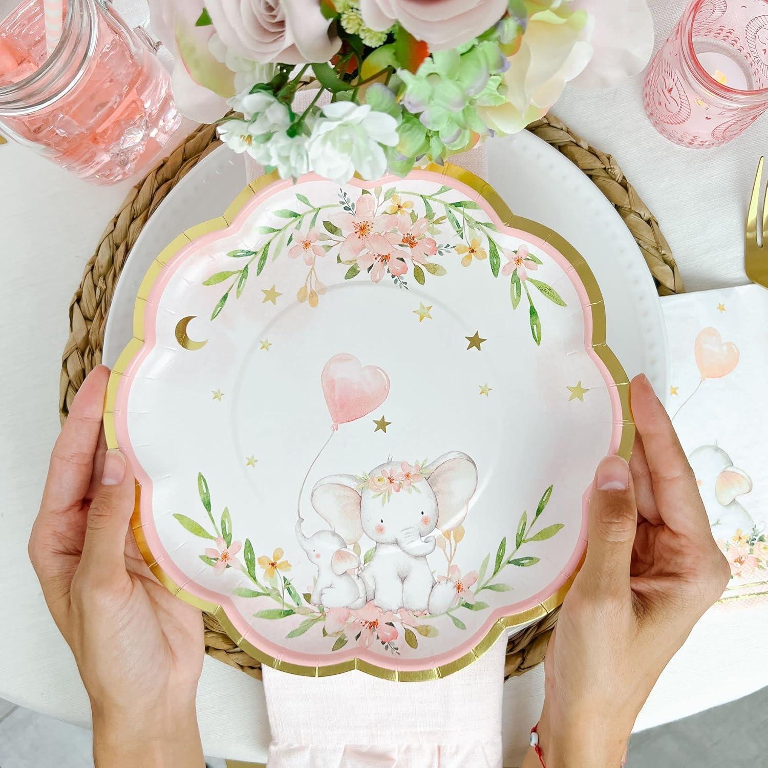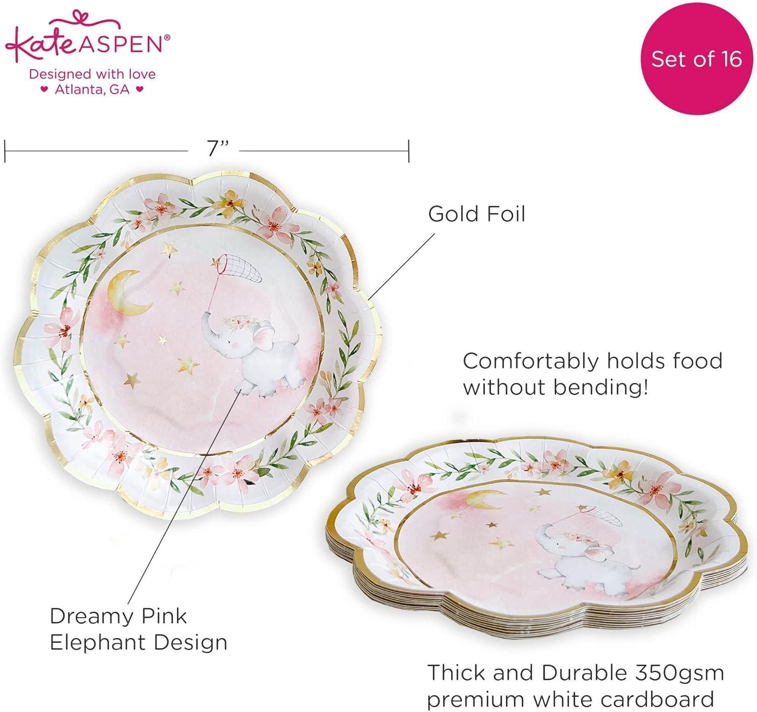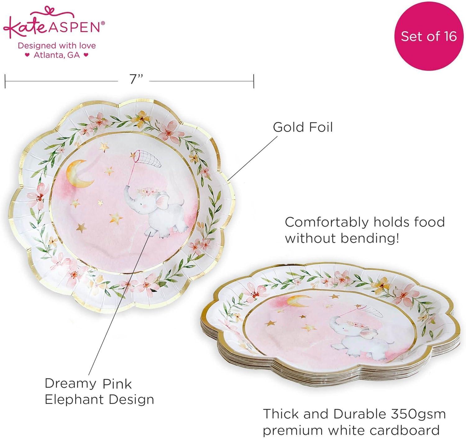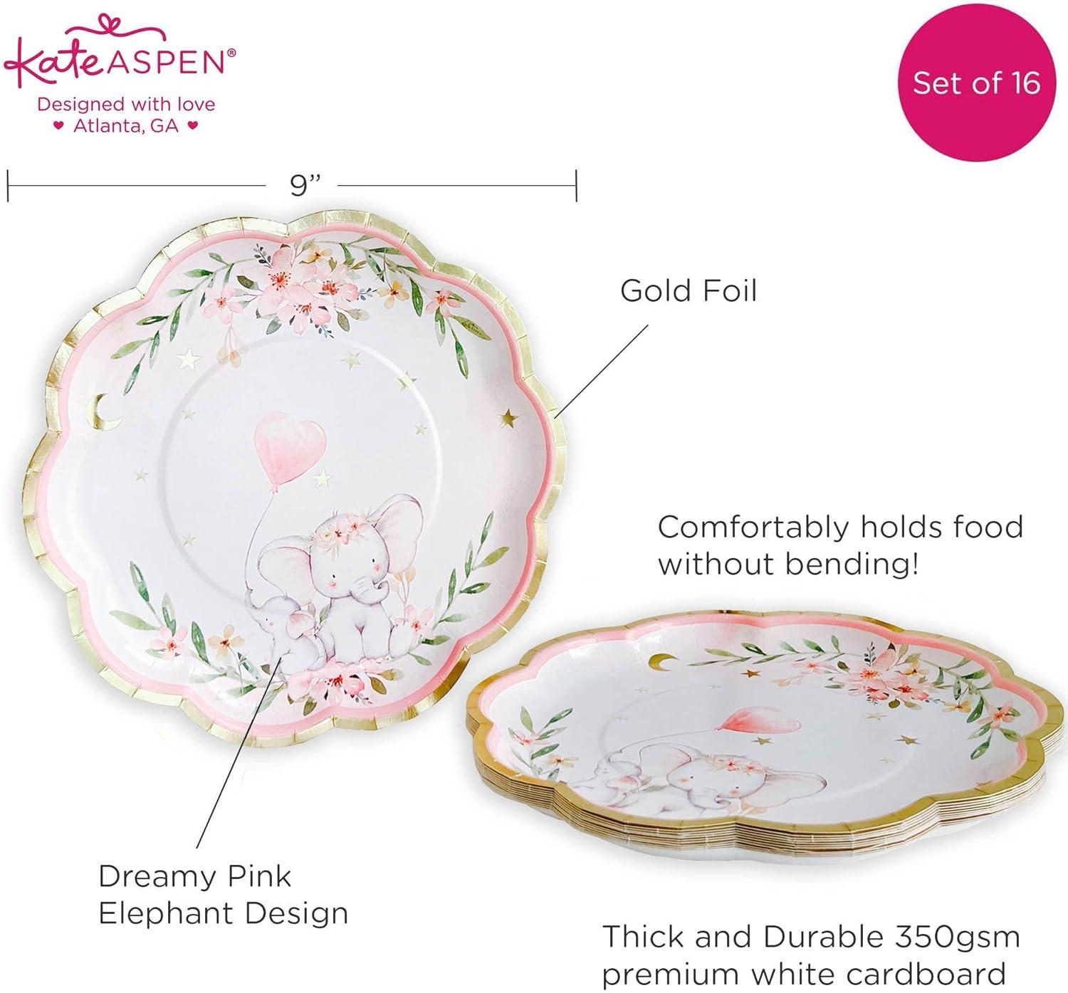 Kate Aspen Sage Green Party Decorations, Eucalyptus Floral Print 7 in. Decorative Premium Paper Plates (350 GSM weight -Set of 16) – Perfect for Greenery Baby Shower & Bridal Showers(Pink Elephant)