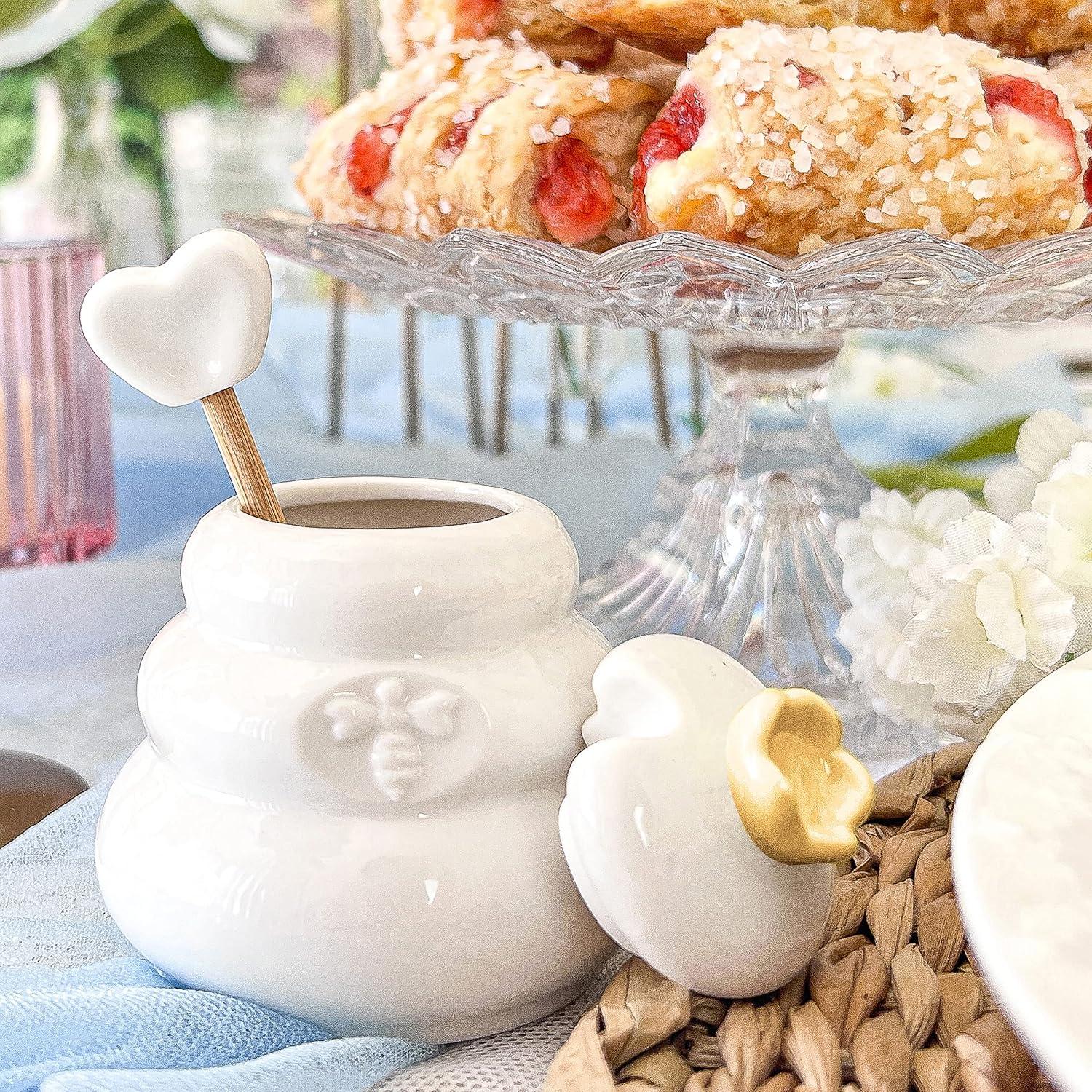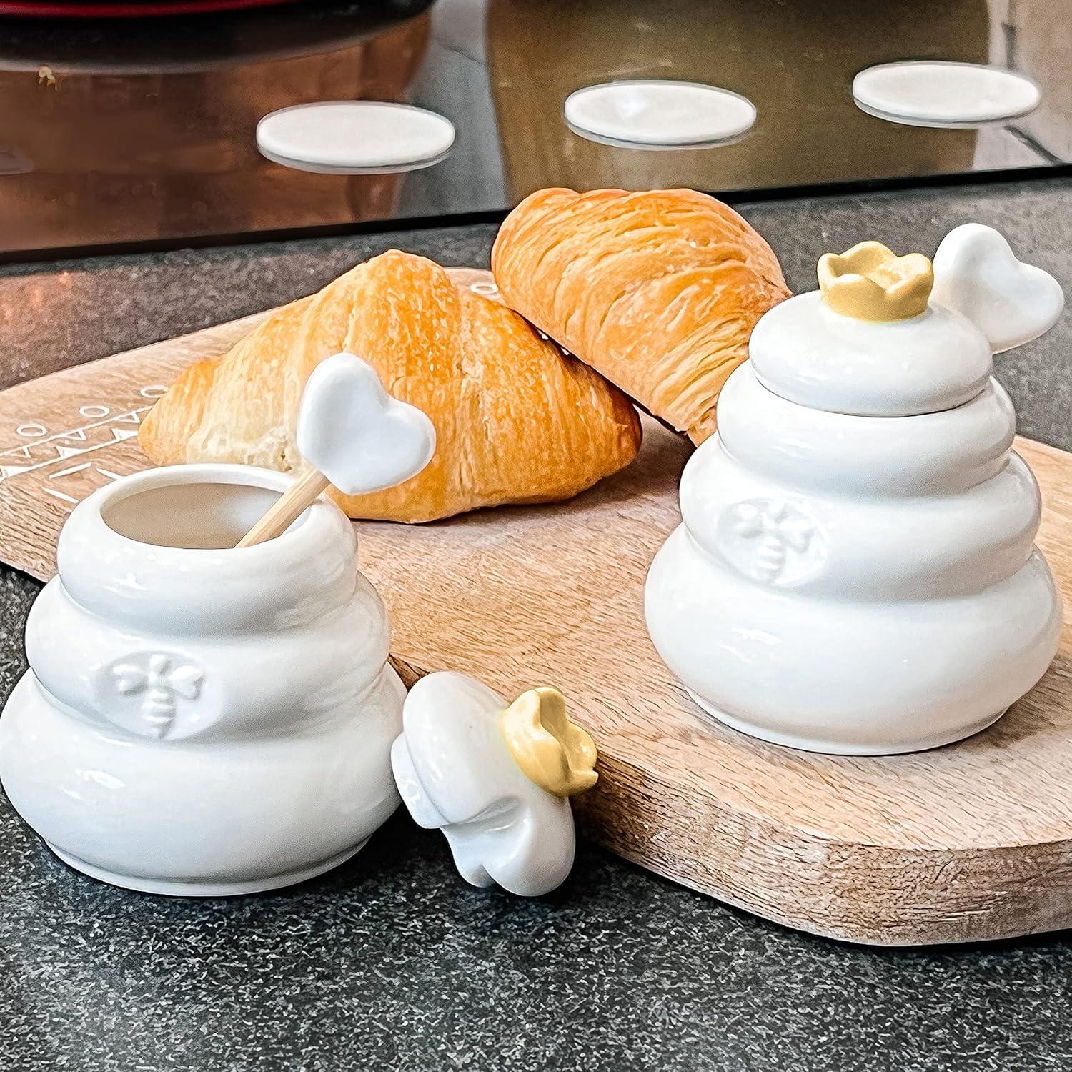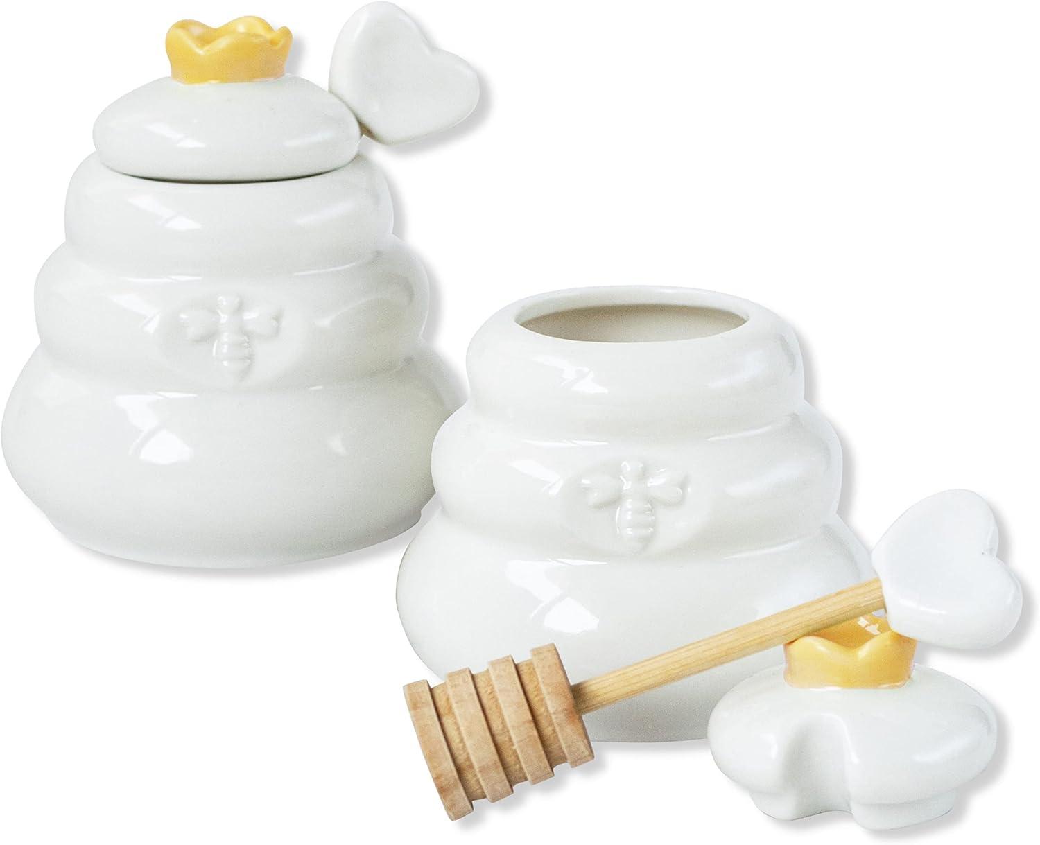 Kate Aspen Sweet as Can Bee Ceramic Mini Honey Pot with Wooden Honey Dipper (3.4 oz) Honey Jar, Bee Decor, White/Yellow (23261WT)(2 Bee Hive Honey Jars)