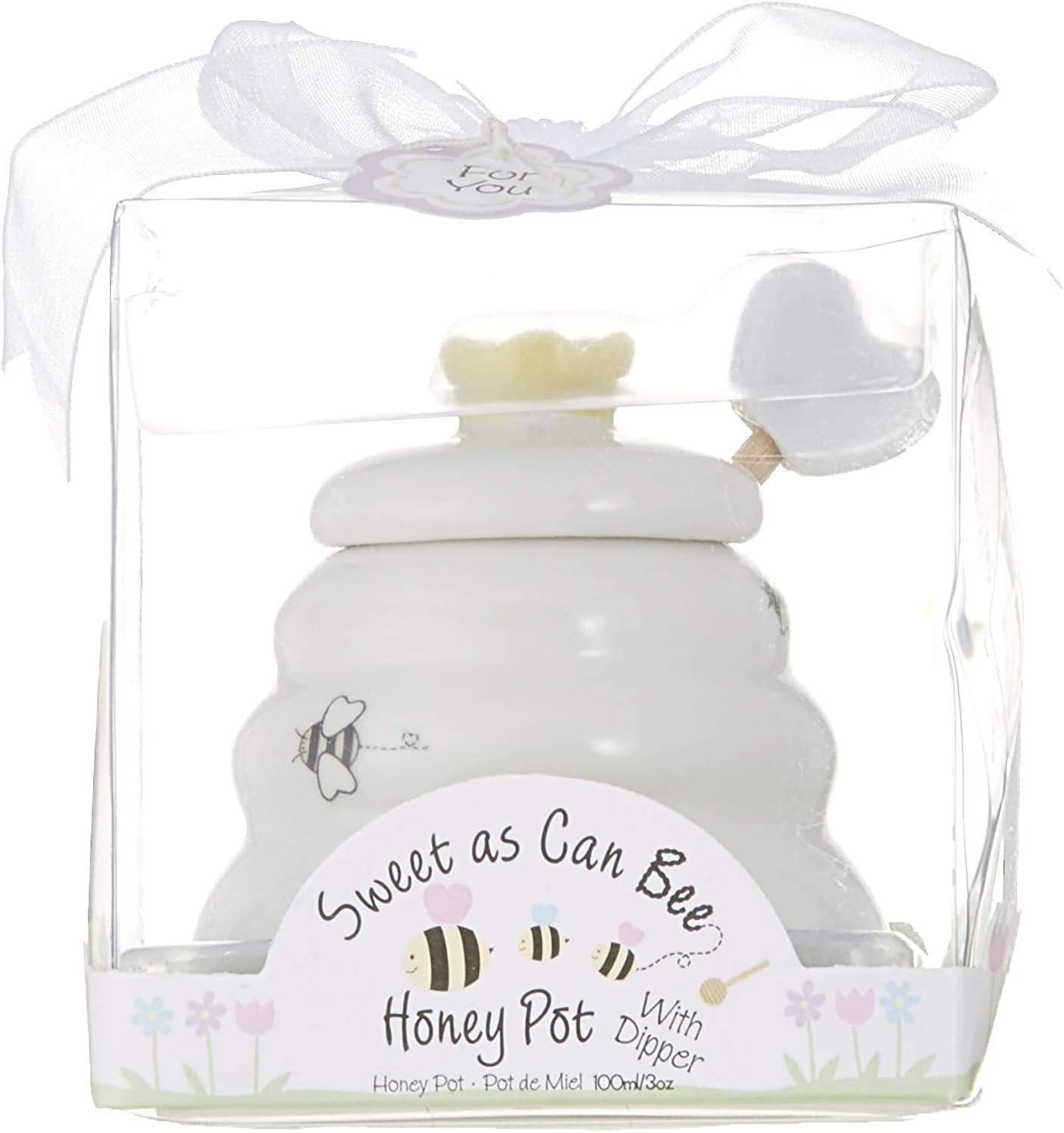 Just how sweet can a baby bee? Sweet as honey, as you can see. Bee hold a honey of a favor that's perfect for celebrating the newbaby. Bee sides its practicality, this ceramic honey pot is bee yond cute, and it simply bee longs at the baby shower. Features and facts: Bee hive shaped, white ceramic mini honey pot is accented with yellow and black honeybees on the base and the lid. Wooden honey dipper's ceramic handle looks like honeybee wings and peeks out through a notch in the lid. Honey pot measures 3″ h x 2 .75″ in diameter. Clear, display gift box has a garden of pastel purple, pink and blue flowers at the base, a Mama Bee and a baby bee with tinyhearts for wings at the front of the base along with the words Sweet As Can Bee Honey Pot with Dipper, and a sheer white, organza ribbon and bow and a flower shaped “”For You”” tag. Gift box measures 3 .25″ h x 3 ” w x 3″ d.
