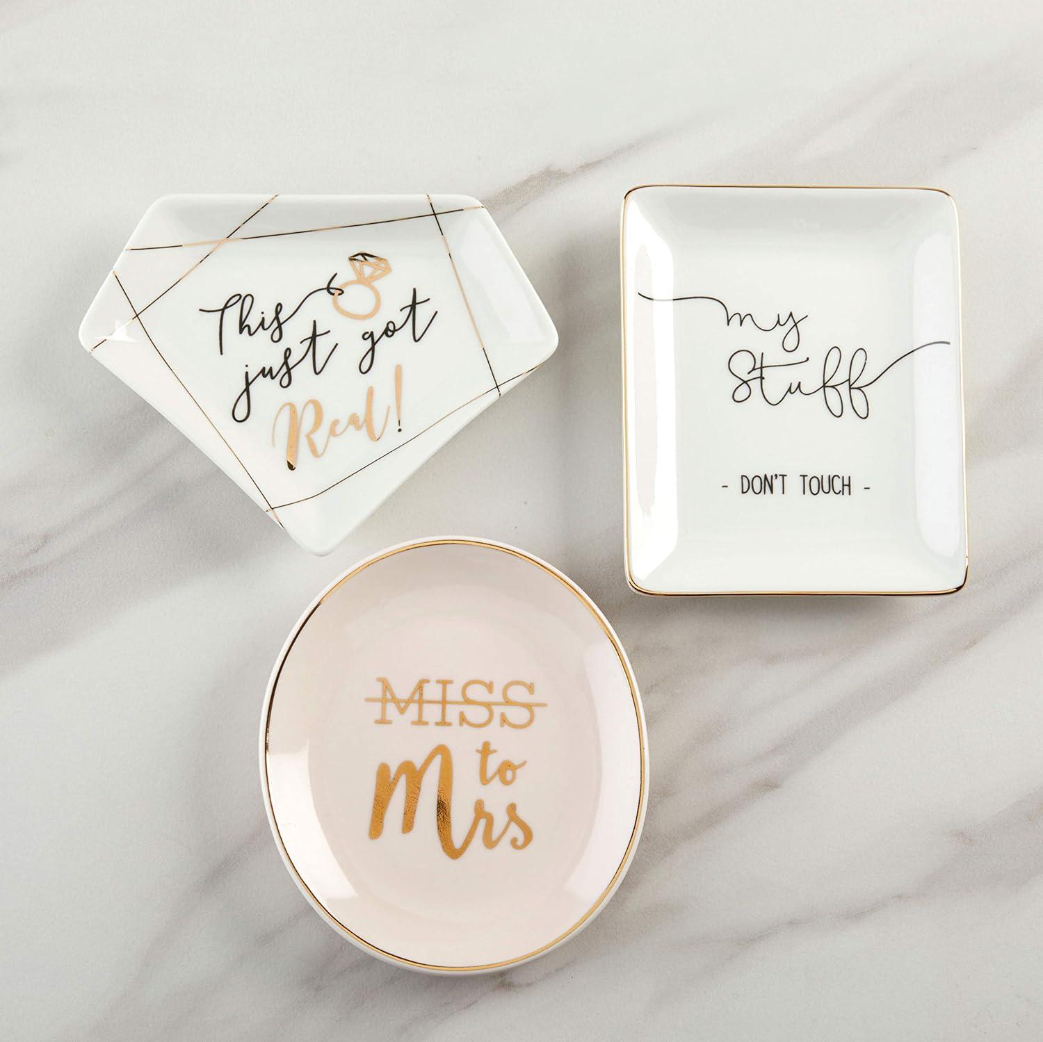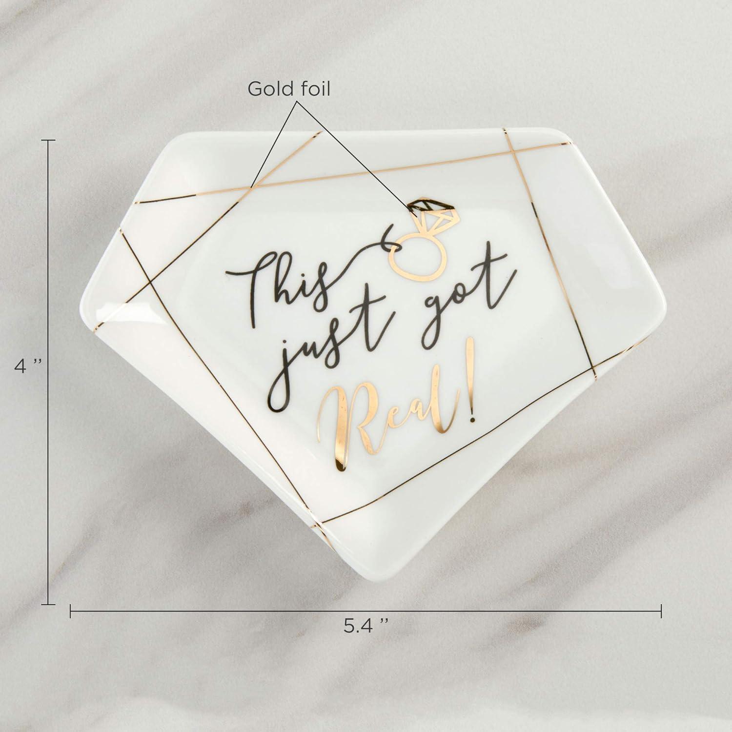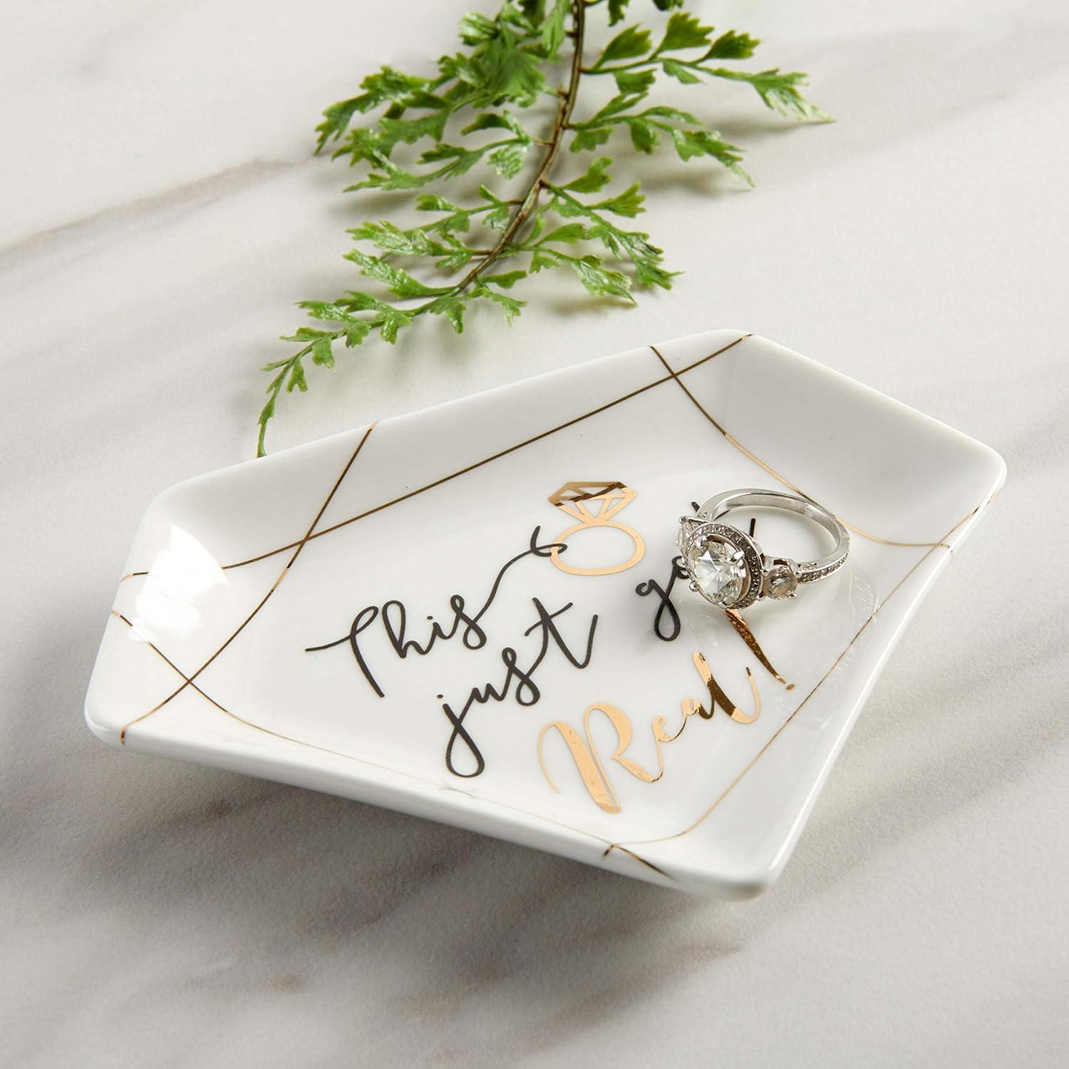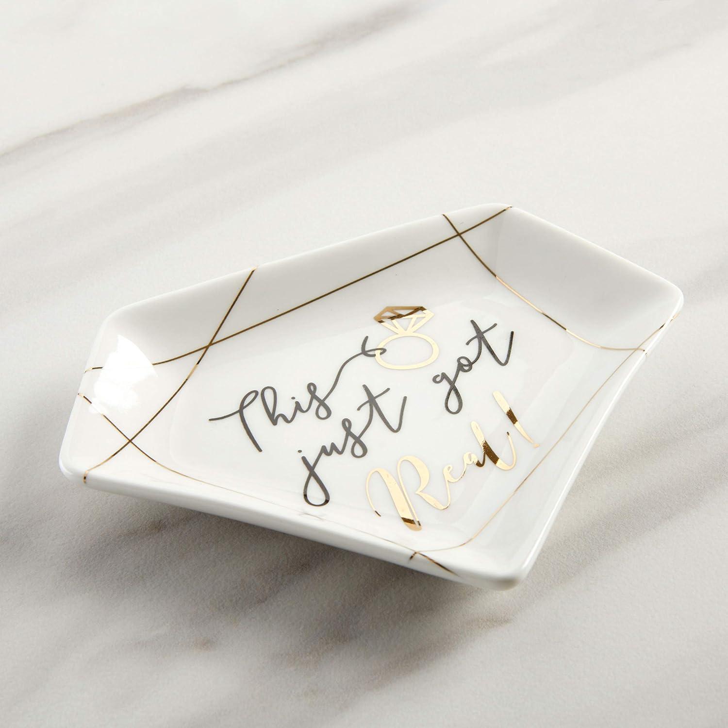 Kate Aspen's This Just Got Real Trinket Dish can be used as a jewelry tray, trinket dish, or candy holder. There are so many ways this wedding trinket dish can come in handy for you and your Husband. You both can use it to keep your wedding rings safe. Everyone knows how difficult it gets when you leave your ring laying in any random place in the house. The moment you forget where you've left it, you're literally at a loss. Who wants to spend countless hours over nothing? Fix that immediately by getting this eye-catching trinket dish. You could use it as décor at your bridal shower, wedding reception, and lastly, in your home. It's currently on-trend so it'll fit in for any of these occasions. You'll be happy you purchased this jewelry tray. Don't let it out of sight! Features and Facts: Sold individually. 1 ceramic trinket dish. White ceramic diamond shape trinket dish with printed gold foil ring and accents. Dish features a message that says “This just got” in black and “Real! ” in gold foil. Decal is placed on center of dish. Measures: 5. 2″ w x 4″ d x 0. 6″ h Packaged: 5. 59″ w x 4. 33″ d x 1. 02″ h