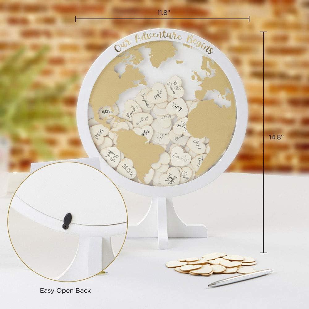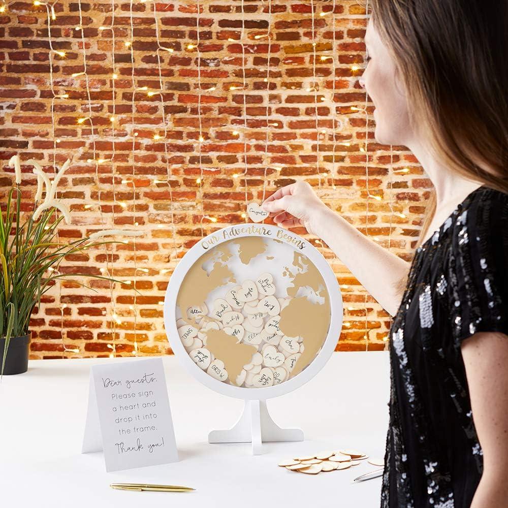 Kate Aspen wedding guest book alternative globe is the travel theme wedding addition that you'll love for many years to come! With a globe Shadow box frame and 100 wooden hearts included, Every guest can immortalize their presence at your big day with this wedding guest book alternative. After the wedding is through, the globe printed frame will display all of your guest signatures alongside a “our adventure begins” Message located at the top of the frame. The wedding guest book alternative globe is packaged up in a gift box for simple transport to your wedding location!