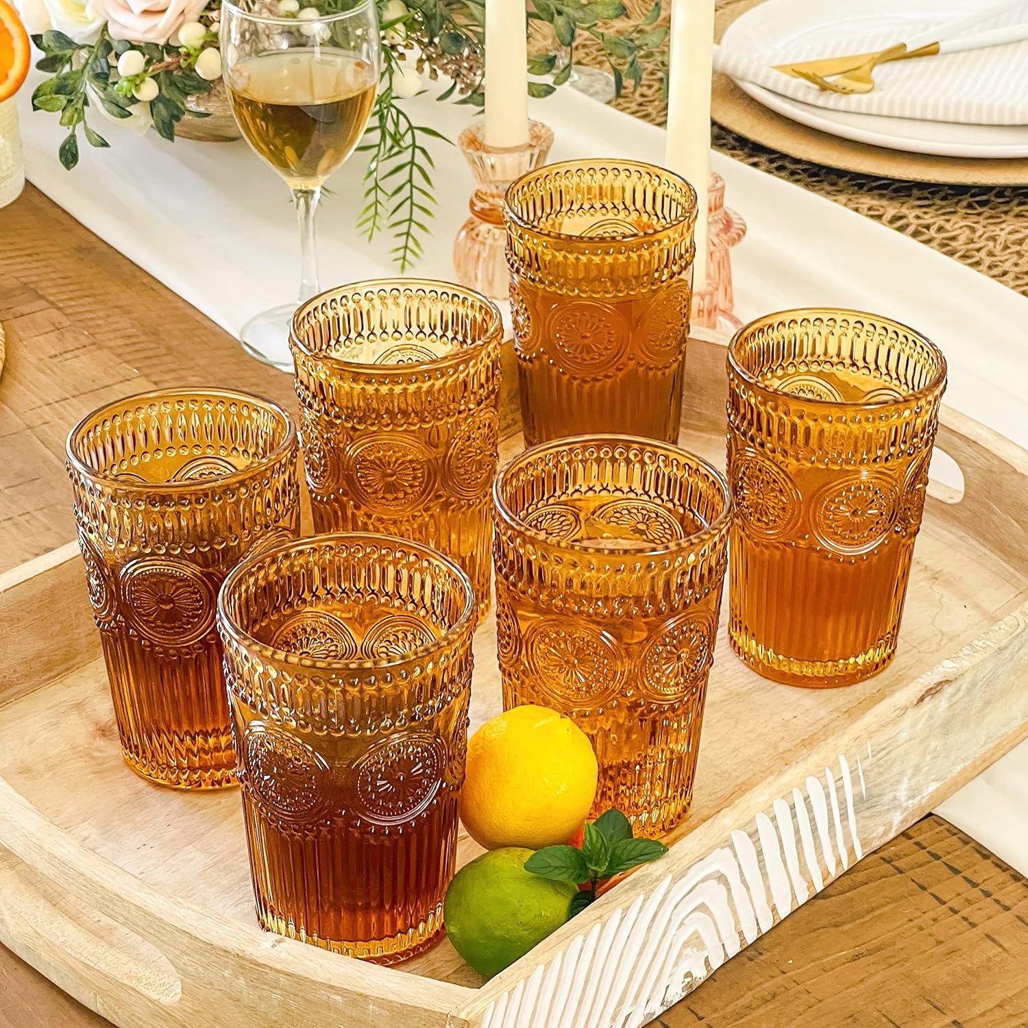 Vintage Textured Rose Gold Striped Drinking Glasses Set of 6, (13 oz) Ribbed Glassware Set | Cocktail Set, Ice Tea Glasses, Juice Glass, Water Cups(Amber)