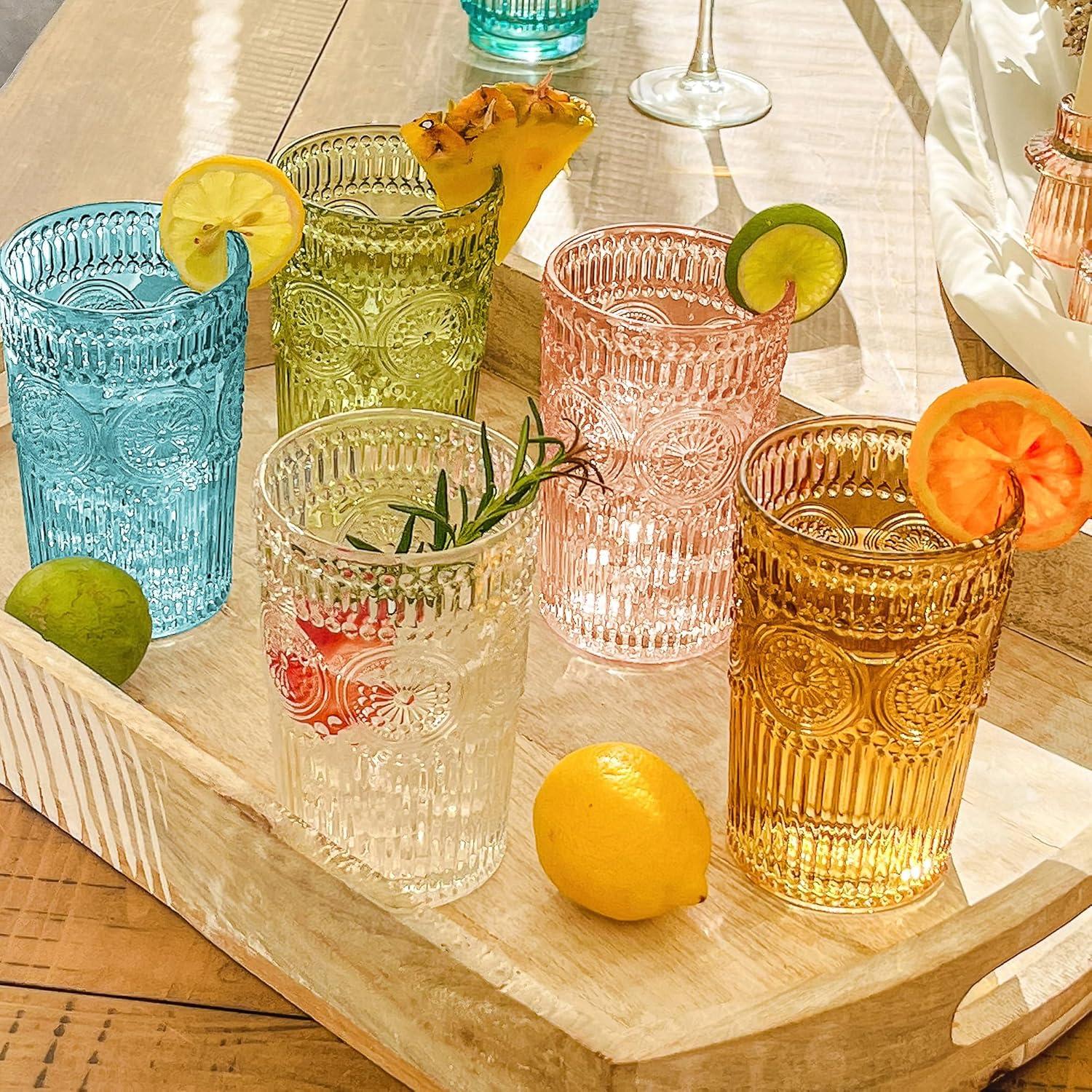 Elevate your drinkware like you elevated your style with this 13 oz. set of Vintage Textured Rose Gold Drinking Glasses. These ribbed glass cups combine a classic hobnail texture with vertical grooves and circular detailing that wraps fully around each glass. The pink-gold hue captures and reflects light beautifully, making each sip feel special. Perfect for cocktails, iced coffee, sweet tea, or juice, these cute glass cups add a vintage glassware touch to dinner tables, bar carts, and party spreads. Durable, lead-free, and perfectly weighted—ideal for everyday use or festive gatherings. Whether you're setting the table for a baby shower, hosting brunch, or upgrading your kitchen glasses, this drinkware set adds timeless charm. Use them as coffee cups, tea glasses, or even for serving bubble tea or as decorative flower cups. Loved by hosts, restaurants, and Pinterest-worthy parties alike, these glasses also make amazing gifts. Add them to your collection of drinking glass sets, ribbed drinking glasses, or cocktail sets. Each drinking glasses set of 6 is bubble-wrapped and shipped in a custom-designed box to ensure safe delivery. Hand wash only. Mix with rose gold plastic cups for party perfection or pair with acrylic cups, colorful wine glasses, or other vintage tea cups for a full kitchen upgrade.