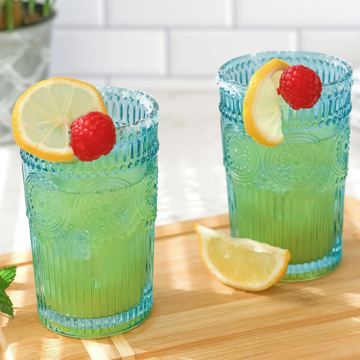 Vintage Textured Rose Gold Striped Drinking Glasses Set of 6, (13 oz) Ribbed Glassware Set | Cocktail Set, Ice Tea Glasses, Juice Glass, Water Cups(Aqua Blue)